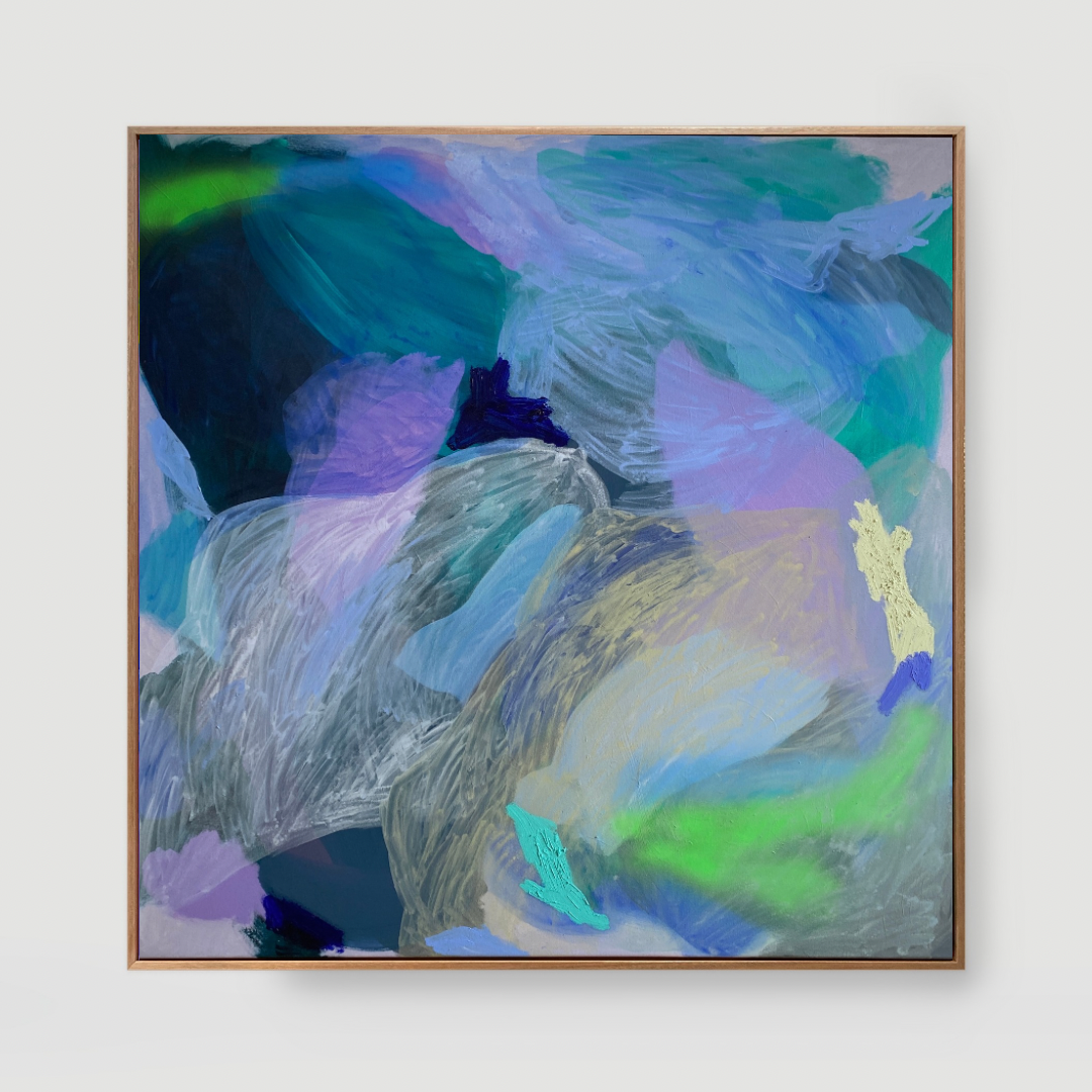 Original. Measuring 100x100cm. Mixed Media on stretched canvas and framed in Flooded Gum.